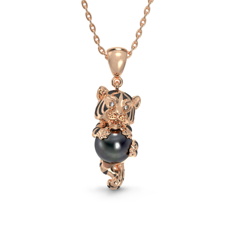 Silver Tiger Pendant with pearl and black enamel from silver 925. You can choose from 18K rose or yellow gold plating for your pendant.